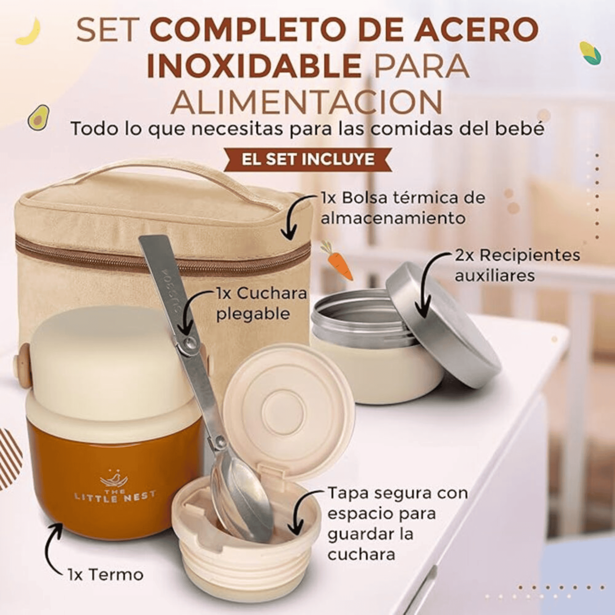 Set térmico de acero inoxidable con doble pared, diseñado para mantener la comida de tu bebé caliente o fría durante horas. Materiales seguros, diseño práctico y pensado para acompañarte en cada salida.